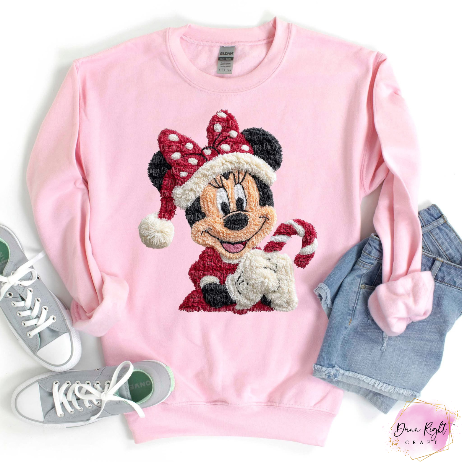 This soft pink crewneck features a crochet-style Minnie Mouse dressed in her Santa outfit and holding a candy cane — the sweetest touch for your Christmas wardrobe! Perfect for cozying up with cocoa, family photos, or gifting to the ultimate Disney fan.