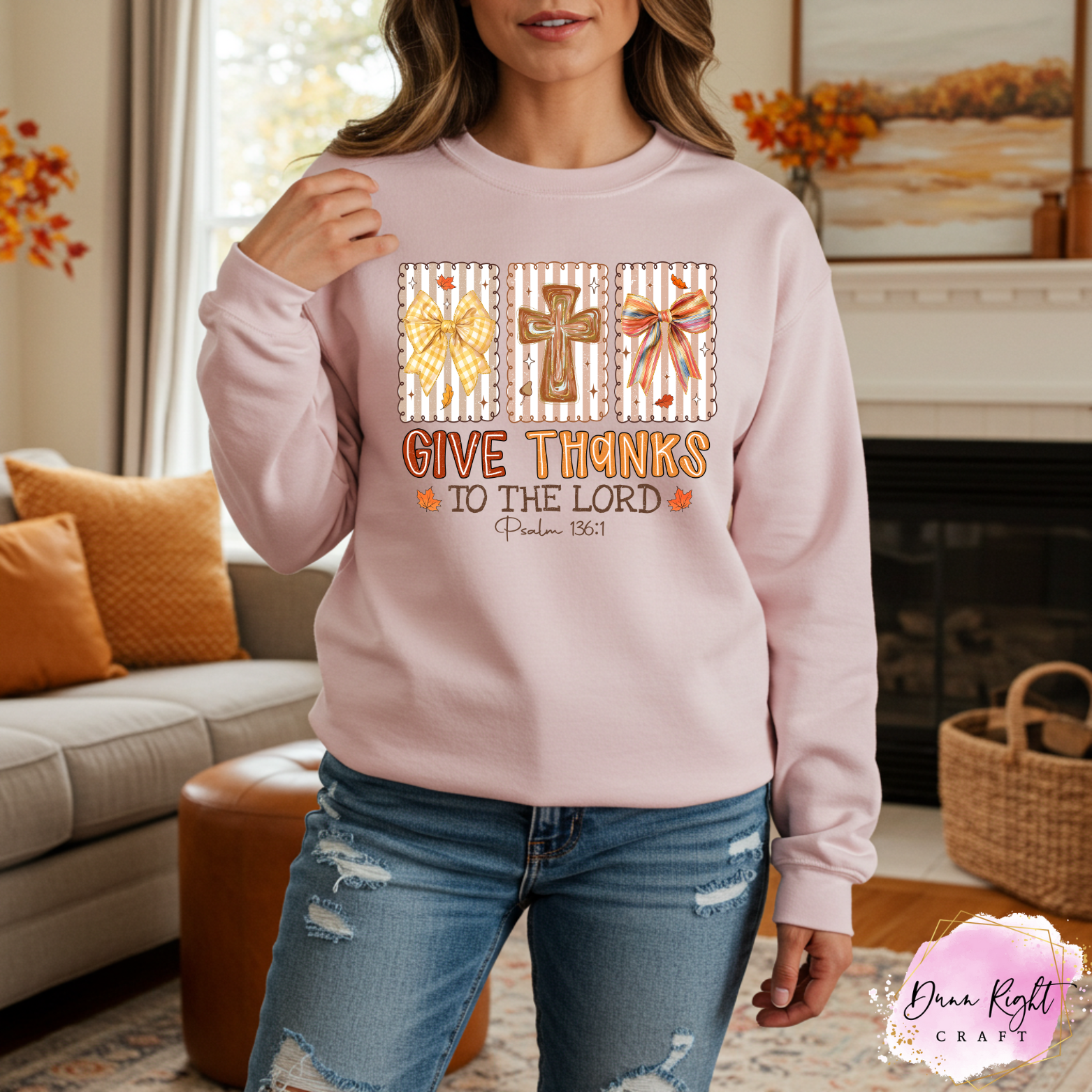 Featuring a warm fall-inspired design with bows, a cross, and the verse Psalm 136:1, this cozy sweatshirt is perfect for Thanksgiving gatherings, Sunday service, or everyday wear during the autumn season.