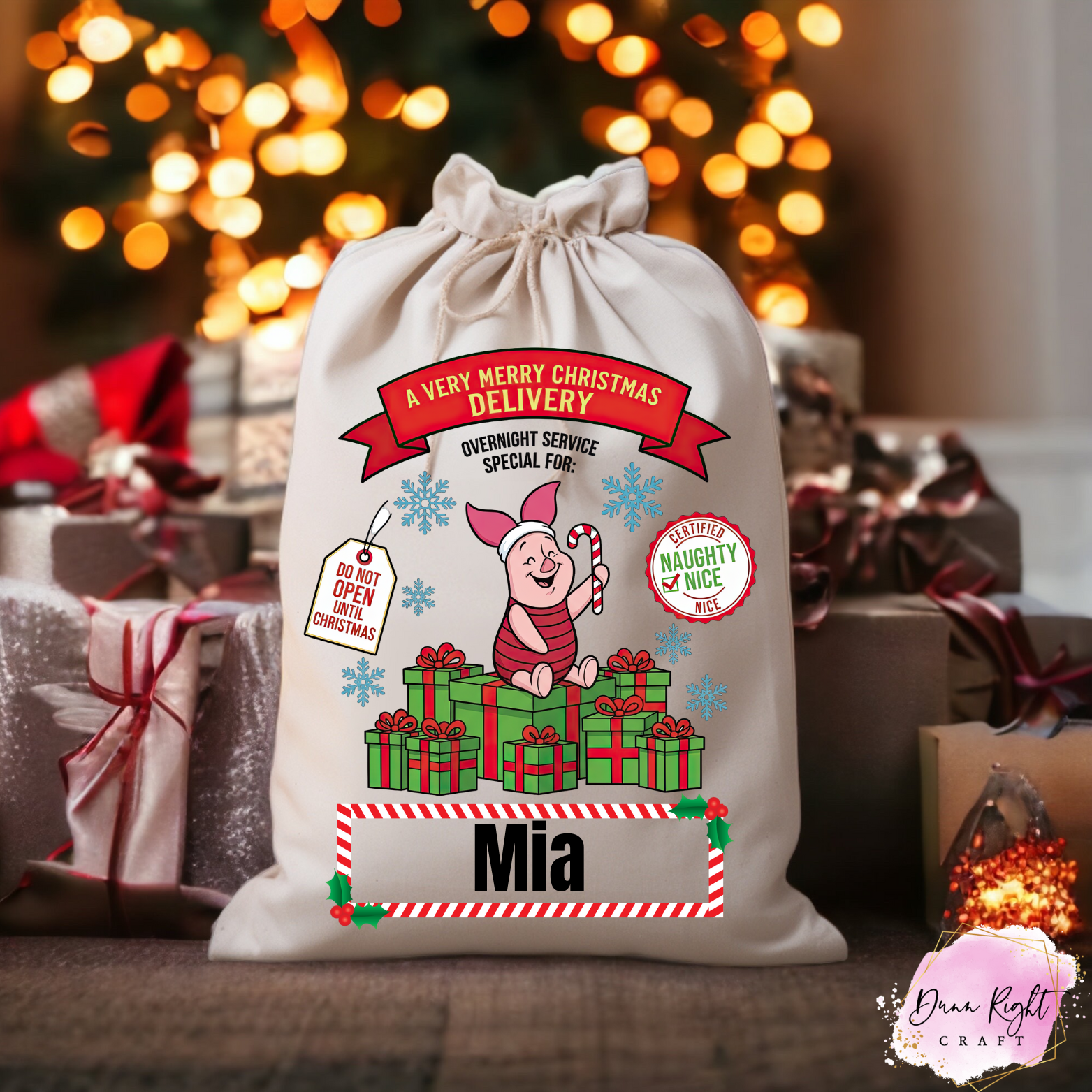 This adorable Santa sack features Piglet surrounded by festive presents and snowflakes — perfect for kids and Winnie the Pooh fans. Add a name to make it uniquely theirs and create a magical holiday tradition year after year.