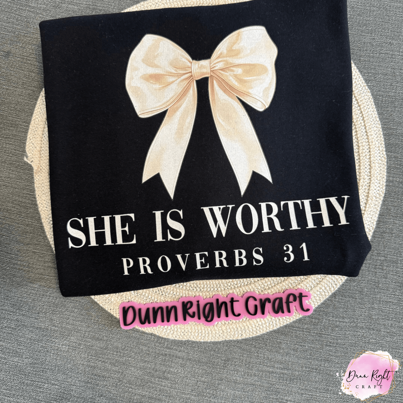 This elegant design features a soft neutral bow paired with the powerful message “She Is Worthy – Proverbs 31”, celebrating strength, grace, and faith. Perfect for women of faith who love subtle, stylish Christian apparel that carries a message of purpose and confidence.