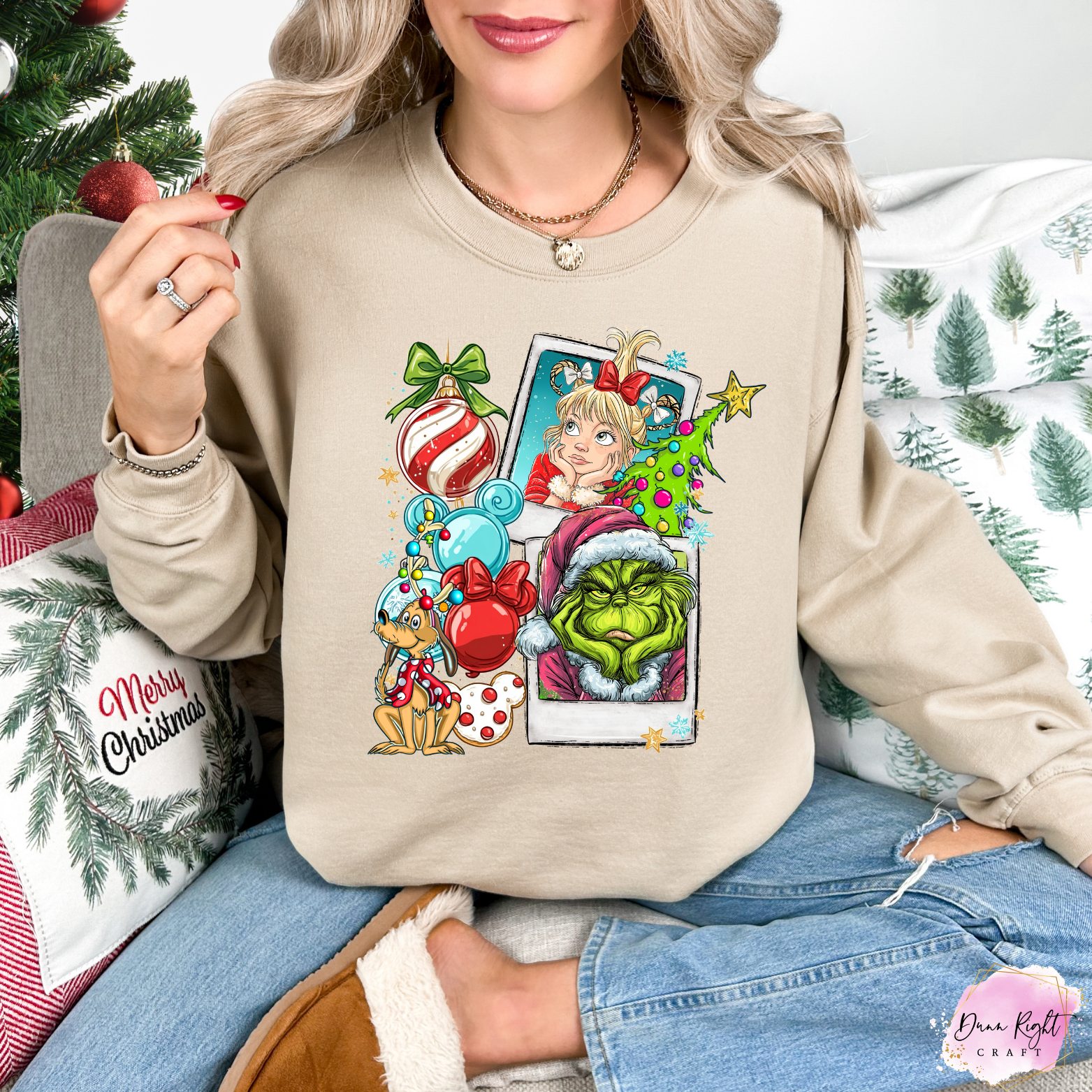 Our Grinch Christmas Sweatshirt combines cozy comfort with holiday mischief. Featuring everyone’s favorite green grump surrounded by candy canes and festive details, this sweatshirt is a perfect way to spread cheer (and a little sass) all winter long.
