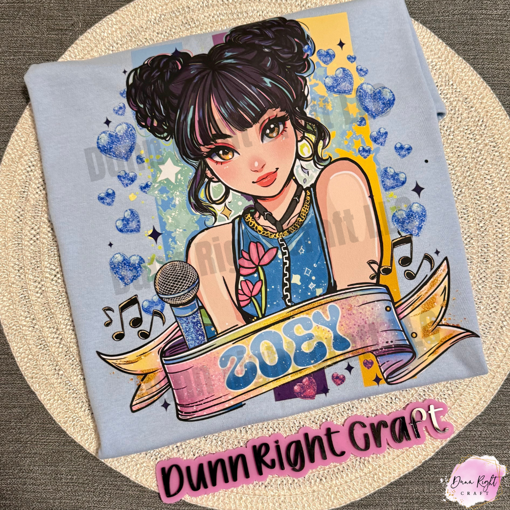 Step into the spotlight with the Zoey K-Pop Girl Shirt 💙 This vibrant tee features Zoey in an anime-inspired design with sparkling hearts, music notes, and microphone details – the perfect mix of cute and bold for any K-Pop fan.